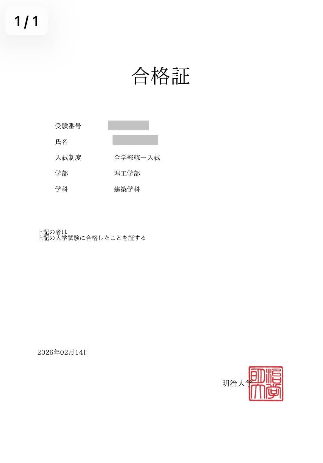 東北大学 工学部 東京理科大学 明治大学 合格Fさん