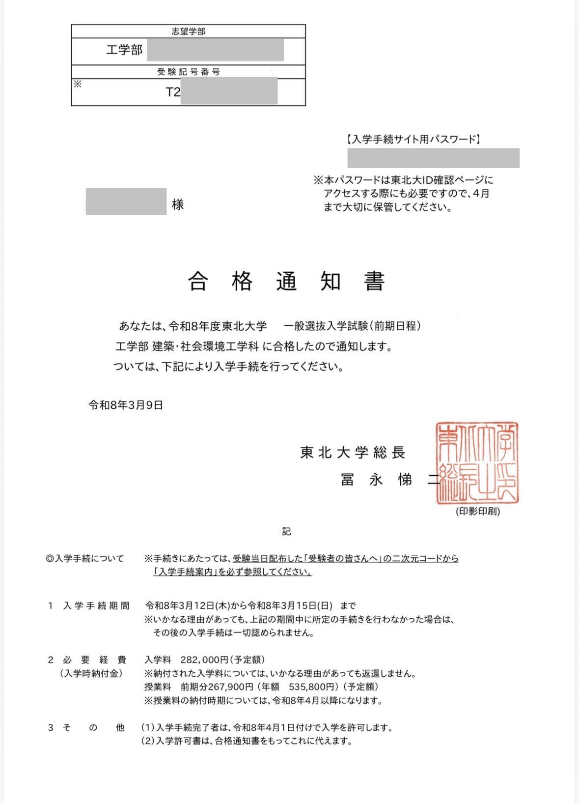 共通テストは出来が悪くてD判定を取ってしまったのですが、この一年間で身につけた学力で東北大学に受かることができました。